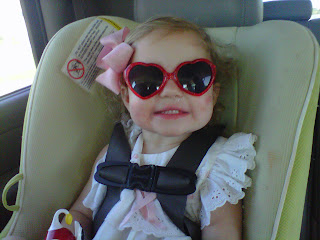 Grant got contacts! Yes people~6 years old~in kindergarten, and wearing contact lens! He broke his glasses Monday, and we couldn't get an appointment with his doctor, so we saw Dr. Feagin. He sat in the chair and said~ "I want contacts." The doctor just laughed. He said it again. The doctor looked at me and I said " I told him to talk to you about it Dr. Feagin". Dr. Feagin took me outside the door and said " as soon as we go towards his eye, he will shut down". Well, he didn't know my son. Grant sat there and let them put both of them in. Then, he showed them how he could take them out himself. He is such a mess. He loves being able to wear sunglasses. And, monkey see~monkey do! Reagan had to have some cool shades of her own.